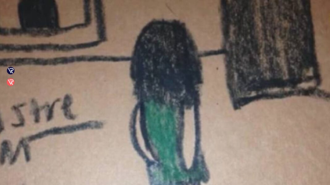 A incapacidade de expressar verbalmente o terror que sente levou o menino a desenhar o que vê. Seus desenhos, embora feitos com traços infantis, são perturbadoramente vívidos. Eles revelam uma figura feminina de aparência macabra, envolta em um longo vestido verde, com cabelos negros cobrindo o rosto. Essa entidade não apenas fica ao lado de sua cama, mas também é vista por ele do lado de fora, vigiando-o pela janela.