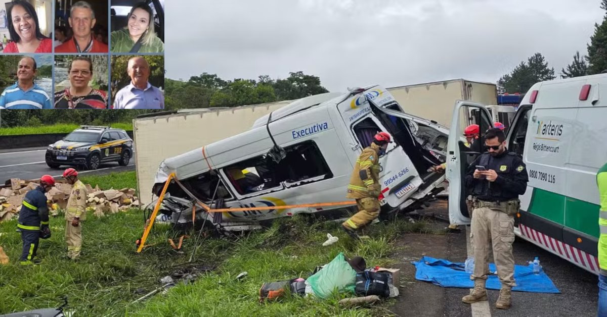 As vítimas, que estavam entre os 21 ocupantes do veículo, foram identificadas como Ivanir Antonio Maziero, de 67 anos, que dirigia a van; Andreia Fagundes da Silva de Souza, de 48; Adriana Machado da Silva, de 42; Cleide Salvador Machado da Silva, de 61; Idezio Simeão da Silva, de 62; e Airton de Mattos, de 93 anos.